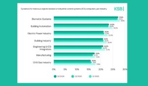 La pressione si distribuisce in modo diverso anche per settore. In cima si colloca la biometria, con il 27,4% dei computer ICS su cui sono stati bloccati oggetti dannosi; seguono building automation (23,5%), energia elettrica (21,3%), edilizia (21,1%), ingegneria e integrazione OT (21,2%), quindi manifatturiero (17,3%) e oil & gas (15,8%). Il quadro conferma che tutti i comparti critici restano obiettivi primari per gli autori delle minacce.