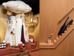 - Al “Door 9”, l’atmosfera diventa più festosa con decorazioni natalizie raffinate e una selezione di peluche a forma di capretta e alpaca, realizzati in lana e cashmere. I visitatori hanno l’opportunità di creare le proprie decorazioni natalizie, utilizzando i pregiati filati della maison.