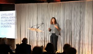L’intervento di Mafe De Baggis, (digital) media strategist e autrice del libro “In principio era Chat GPT” sulle intelligenze artificiali generative e il loro impatto sulla comunicazione e la creatività ha evidenziato che queste tecnologie sono entrate nel quotidiano di professionisti, aziende e agenzie, integrando i processi creativi e produttivi e scatenando una curiosità e una creatività impreviste. Sono tecnologie acerbe e ancora problematiche, da affrontare comunque con spirito costruttivo, mettendo in moto una collaborazione tra intelligenze diverse.